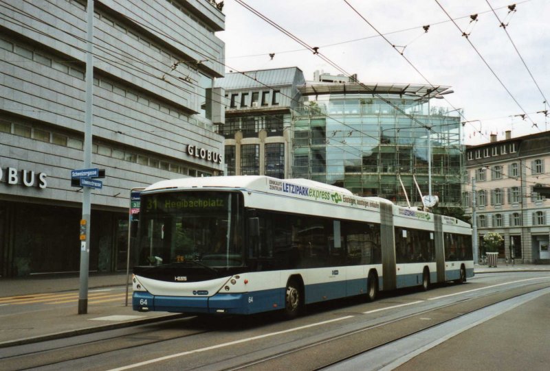 VBZ Zürich Nr. 64 Hess/Vossloh Doppelgelenktrolleybus am 12. Juli 2009 Zürich, Löwenplatz