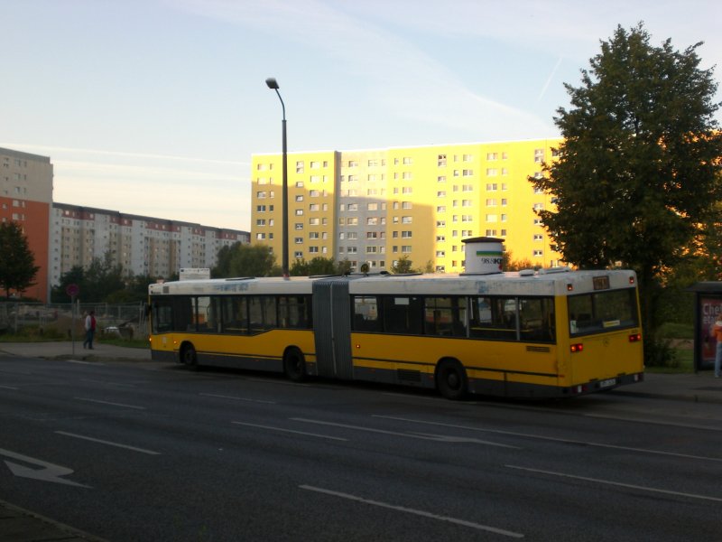 Mercedes-Benz O 405 N (Niederflur-Stadtversion) auf der Linie 154 nach U-Bahnhof Elsterwerdaer Platz an der Haltestelle Hohenschönhausen Falkenberger Chaussee/Prendener Straße.