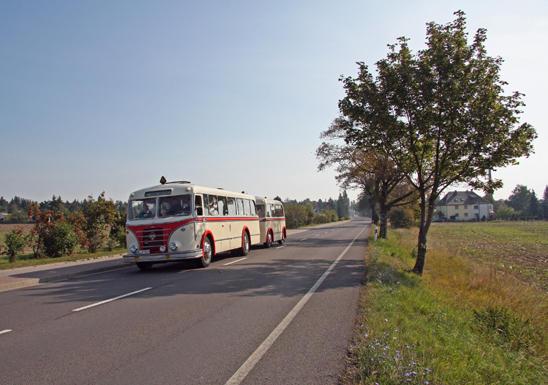 Wenn drei sich streiten, ist keiner mehr da, der sich freuen kann. Auf Grund von Kleinstaaterei im einheimischen Rathaus wurde zum 100jährigen Jubiläum des Schkeuditzer Straßenbahndepots Schienenersatzverkehr gefahren. Zum Glück mit historischen Bussen, hier der Fleischer S5 am 20.09.2009 in Leipzig-Lützschena.