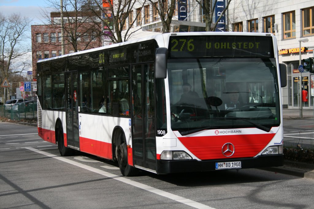 Der bald älteste Bus in Hummelsbüttel mit Abgang der letzten 17er nämlich der 2000 gebaute 1908 am 4.April 2010 auf der Linie 276 in Richtung U-Ohlstedt am S Bahnhof Poppenbüttel.