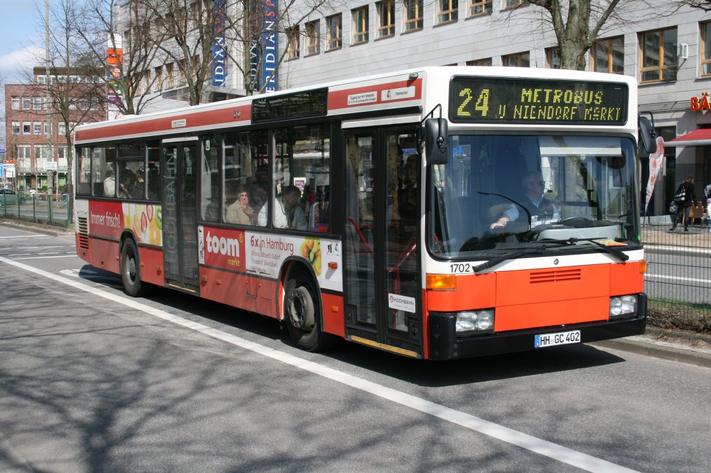 Der vor noch nicht allzulanger Zeit nach Hummelsbüttel gekommene 1702 auf der Linie 24 in Richtung U-Niendorf Markt. Leider wird auch er nicht mehr lange das HHA Zeichen tragen.