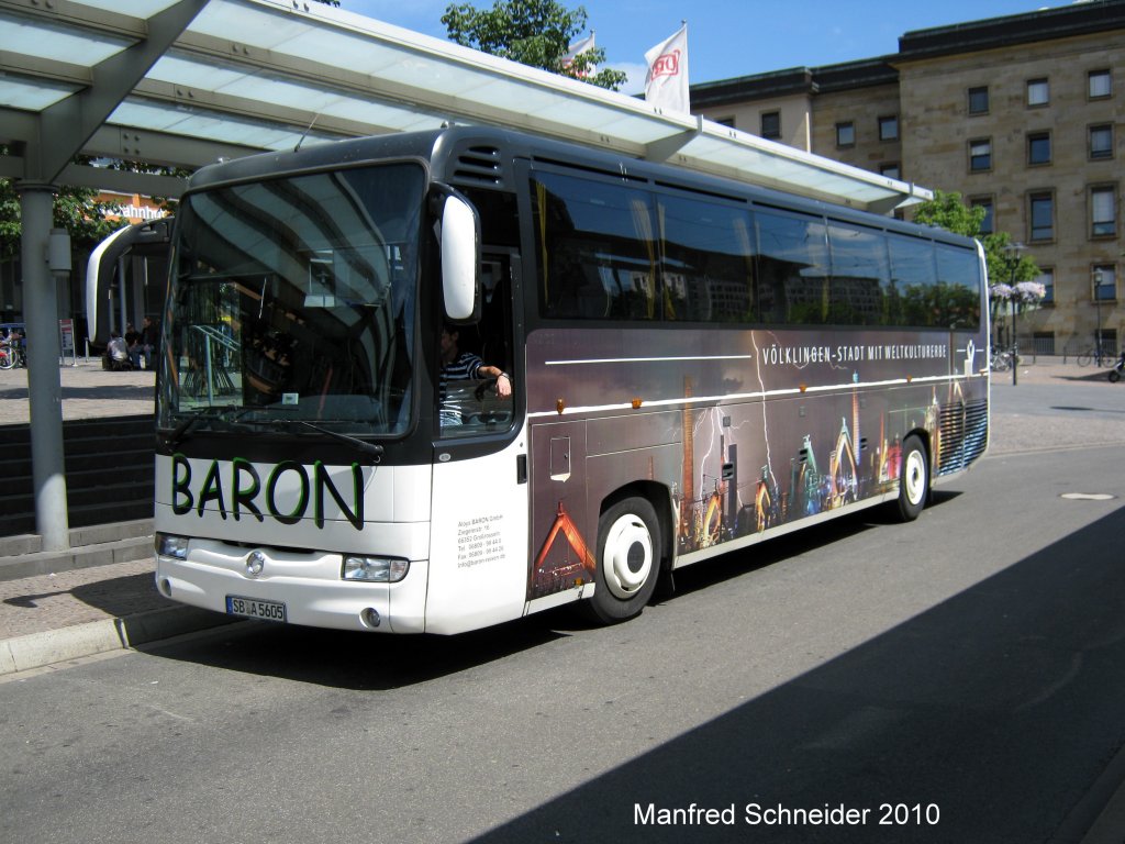 Hier ist ein IRIS Reisebus der Firma Baron Reisen zu sehen. Der Bus trägt Werbung des Weltkulturerbe Völklinger Hütte im Saarland. Die Aufnahme des Foto war am 31.07.2010 in Saarbrücken am Hauptbahnhof.