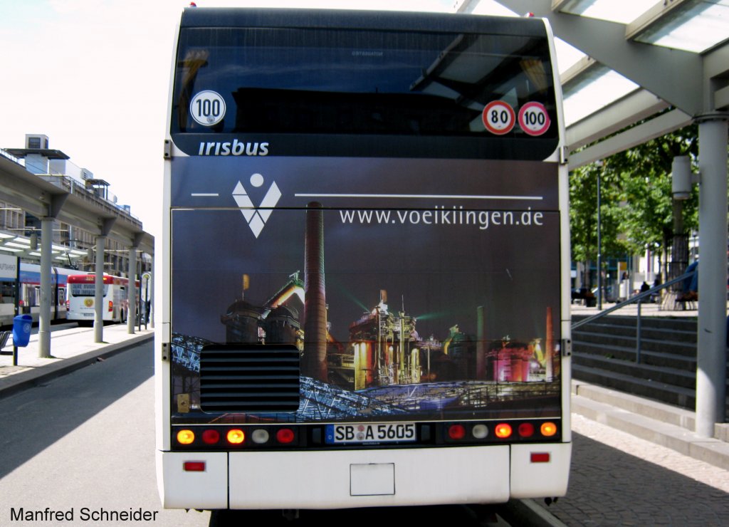 Hier ist ein IRISBUS (Reisebus) der Firma Baron Reisen zu sehen. Der Bus trägt Werbung des Welt Kultur Erbe Völklinger Hütte im Saarland. Die Aufnahme des Foto war am 31.07.2010 in Saarbrücken am Hauptbahnhof.