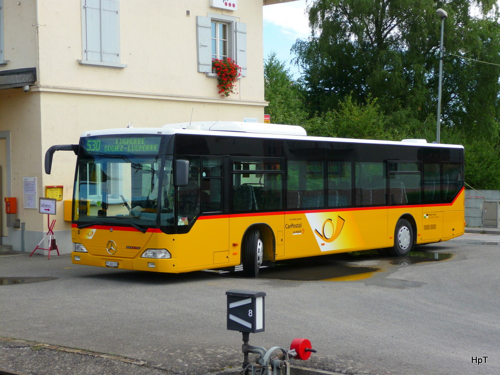 Postauto - Mercedes Citaro FR 300535 bei der Haltestelle vor dem Bahnhof in Sugiez am 30.07.2010