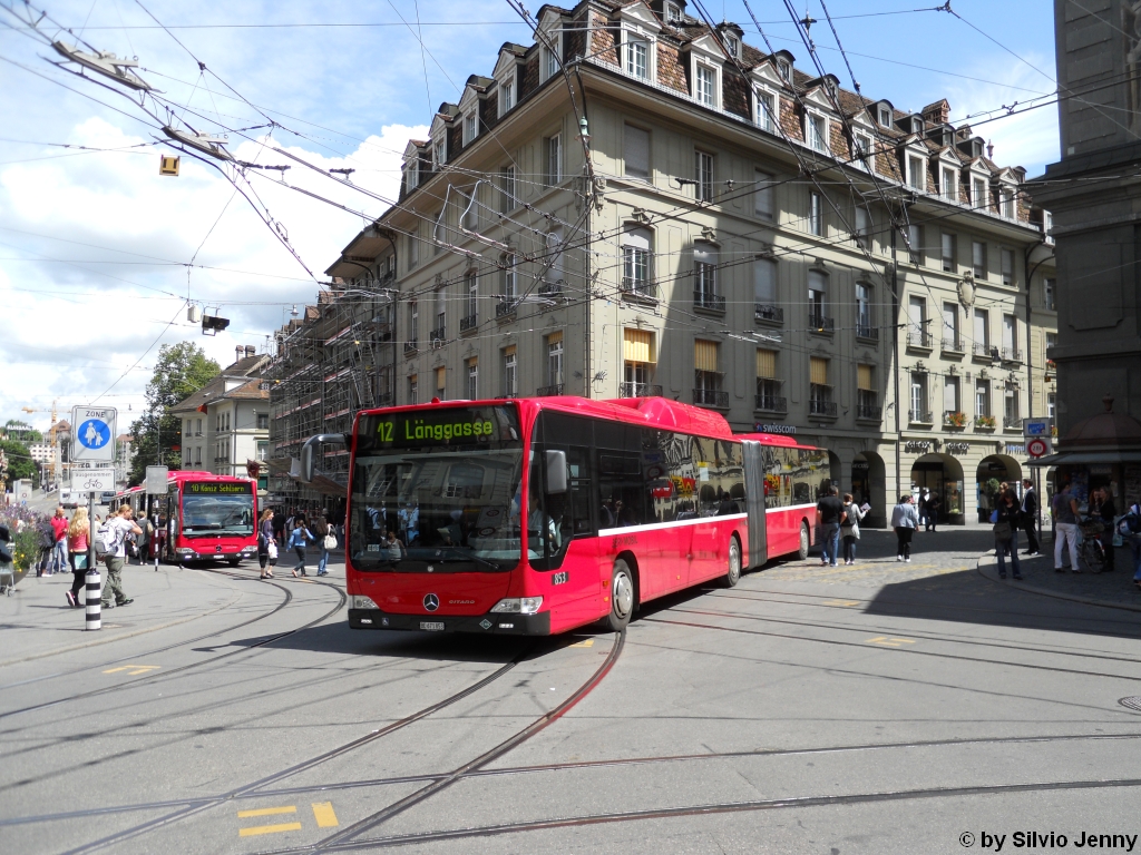 Während der Bernmobil CitaroII CNG Nr. 853 auf der Linie 12 den Zytgloggeturm umfahren hat, ist beim Wagen 850 auf der Linie 10 der Fahrgastwechsel noch voll im Gange. Bern, Zytglogge am 6.8.2010