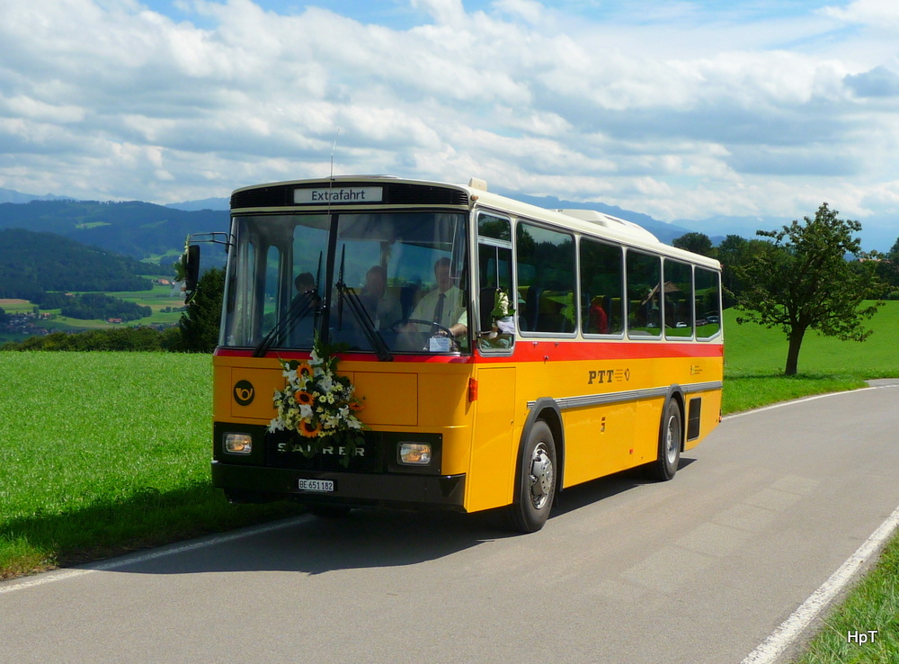 Bernair / Reisepost - ex PTT Ein Stück Schweizer Geschichte ein Saurer RH 525-23 BE 651182 unterwegs auf einer Extrafahr auf dem Belpberg am 29.08.2010