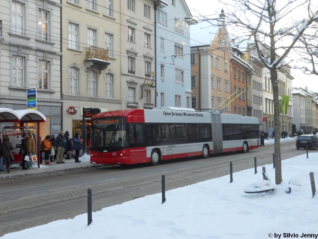 Stadtbus Winterthur Nr. 102 (Hess Swisstrolley 3 BGT-N1C) am 18.12.2010 bei der Schmidgasse.