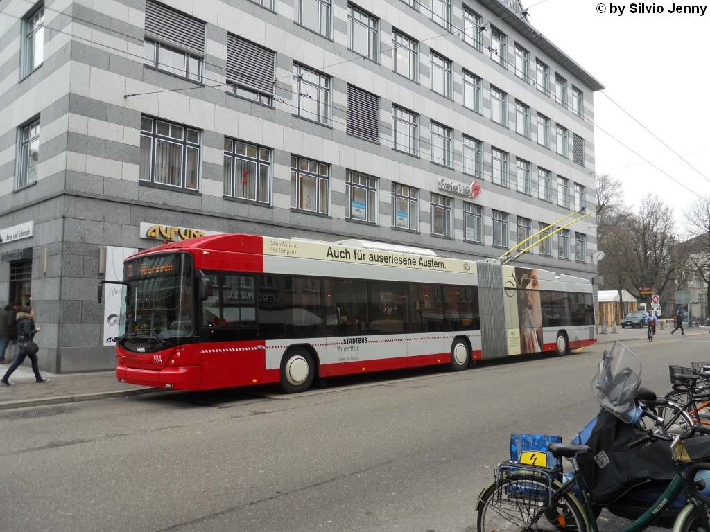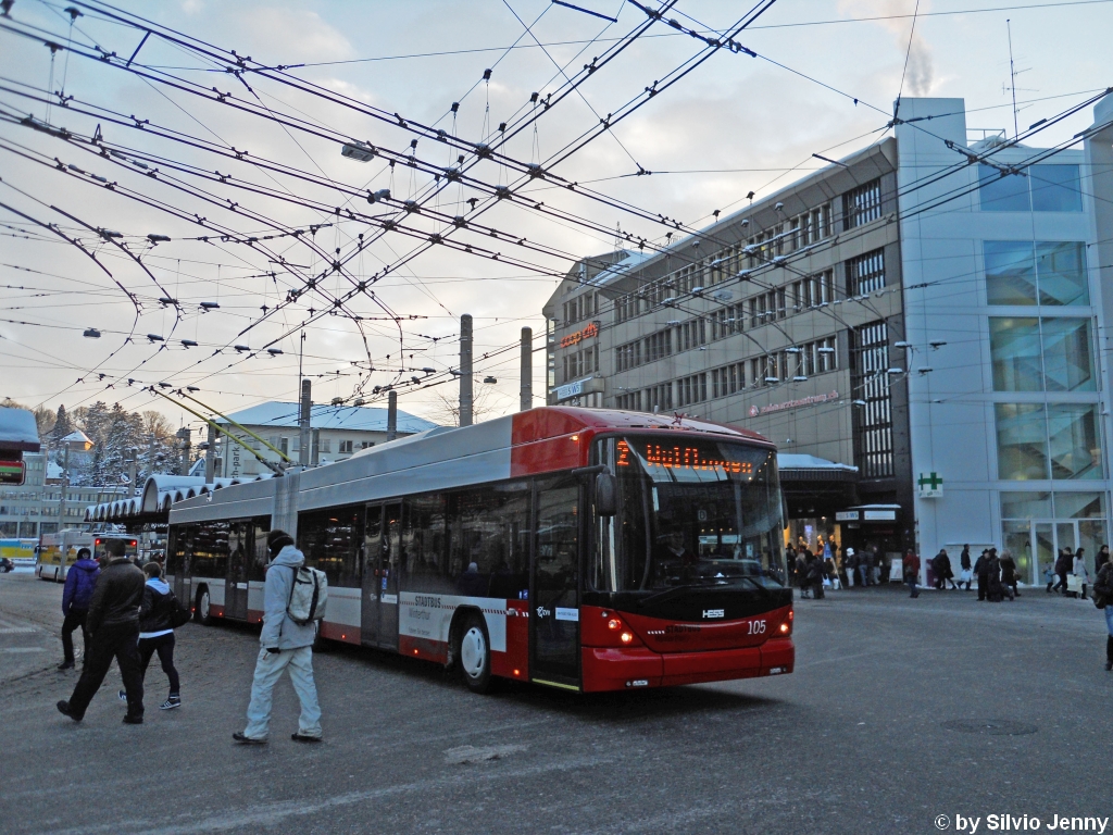 Stadtbus Winterthur Nr. 103 (Hess Swisstrolley 3 BGT-N1C) erreicht am 18.12.2010 den Hauptbahnhof.