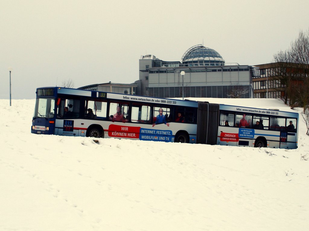 Bei Schnee und einer mehrere cm. dicken Eisschicht kämpft sich am 02.02.2010 Linie 33 der ASEAG auf der Forckenbeckstrasse die Steigung hoch.