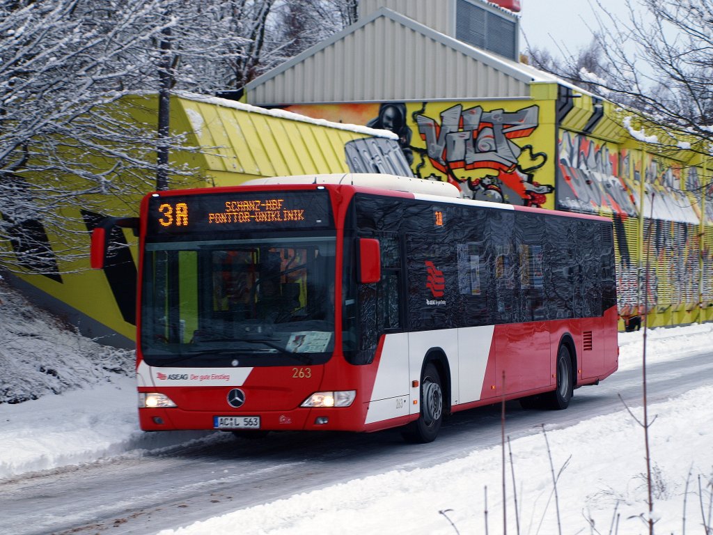 Bei Schnee und einer mehrere cm. dicken Eisschicht kämpft sich am 02.02.2010 Bus Nr.263 der ASEAG (Linie 3a) auf der Forckenbeckstrasse langsam vorwärts.