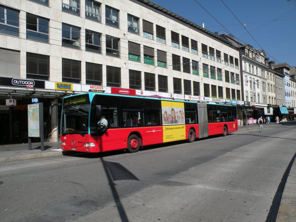 VBZ Nr. 102 (Mercedes O405GTZ) am 28.1.2010 beim Klusplatz, wo prekäre Platzvrhätlnisse herrschen, u.a. sind daher die Lightrams auf dem 34er nicht zugelassen (wobei sie auch nicht nötig wären), des weiteren können auf den Tramlinie 8 und 15 nur Solotrams (Tram 2000 oder Mirage) eingesetzt werden.