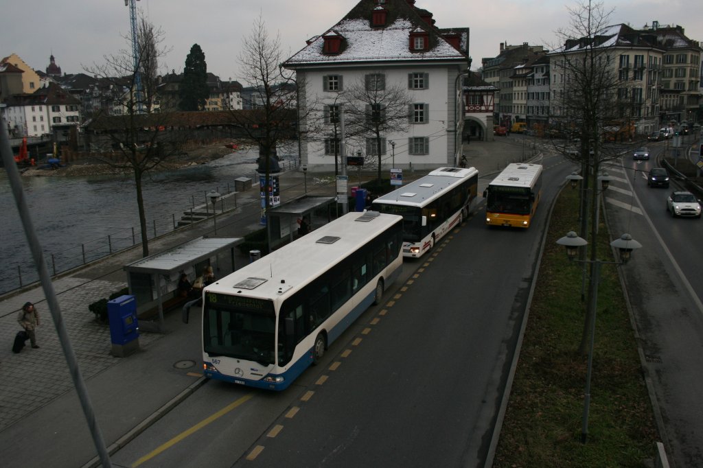 Zwischen dem Bahnhof und dem Kasernenplatz in Luzern sind Fahrzeuge von vier Busbetrieben anzutreffen. Drei davon konnte ich am 22.1.2010 am Kasernenplatz festhalten: VBL-Citaro 67 (2006), ARAG-Setra 319NF (2004) und ein NÜ313 von PU Stirnimann (2002).
