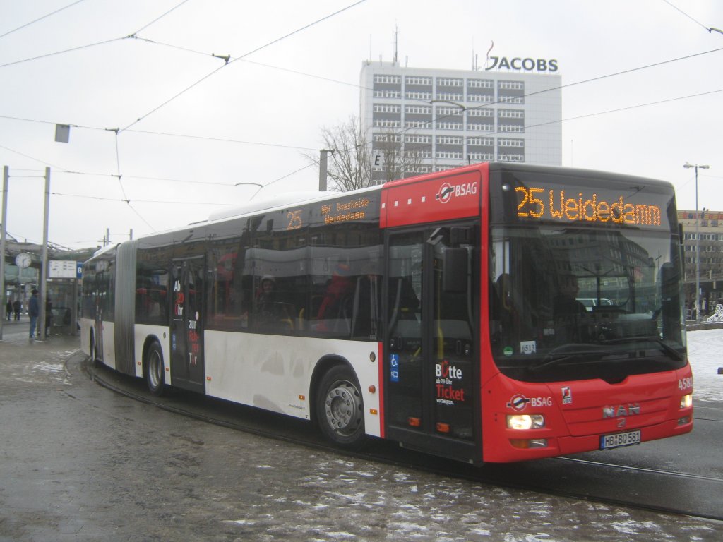 Noch sehr neu ist dieser MAN Lion´s City GL der BSAG, er trägt die Wagennummer 4581 und bedient die Linie 25 vom Nußhorn bis zum Weidedamm. An diesen Bussen habe ich nichts auszusetzen. Sie sind bequem, leise und schön groß.