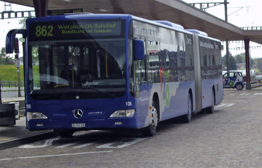 VZO-Mercedes Citaro NR.106 am Bahnhof Wetzikon am 24.5.10. Dieser VZO Bus ist einer der wenigen bei dem noch beide Aussenspiegel in blauer Wagenfarbe sind.
