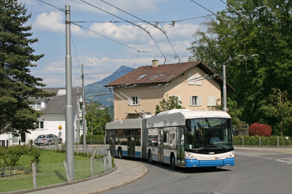 Der Hess/Vossloh-Kiepe BGT-N2C "Swisstrolley 3" Nr. 218 am 25. Mai 2010 am oberen Ende der Bodenhofstrasse.