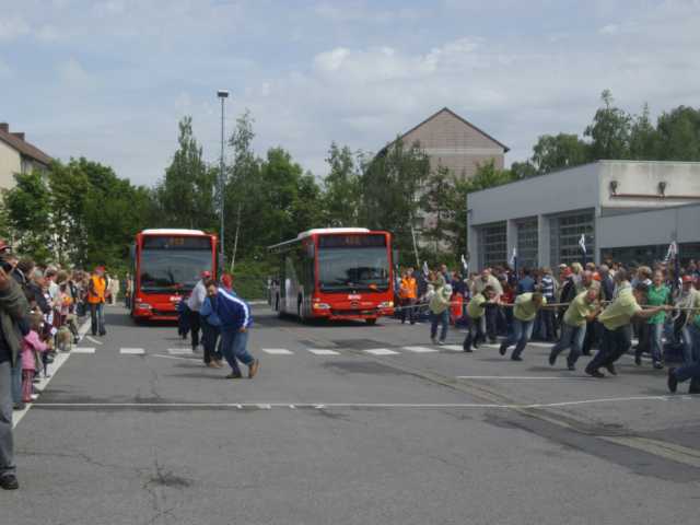 Hier sehen Sie, wie gerade das Buswettziehen auf dem Betriebshof der VKU in Kamen stattfindet.
