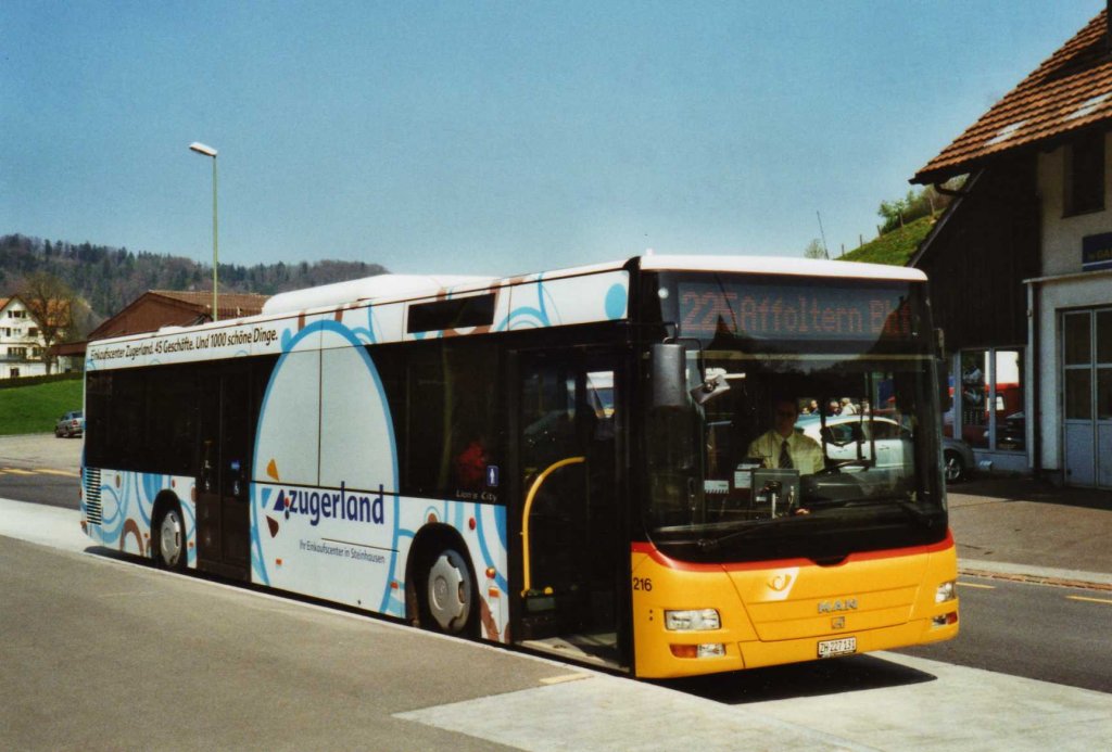 Stutz, Jonen Nr. 216/ZH 227'131 MAN (ex Nr. 20) am 24. April 2010 Aeugstertal, Kloster (mit Vollwerbung für "Einkaufscenter Zugerland")