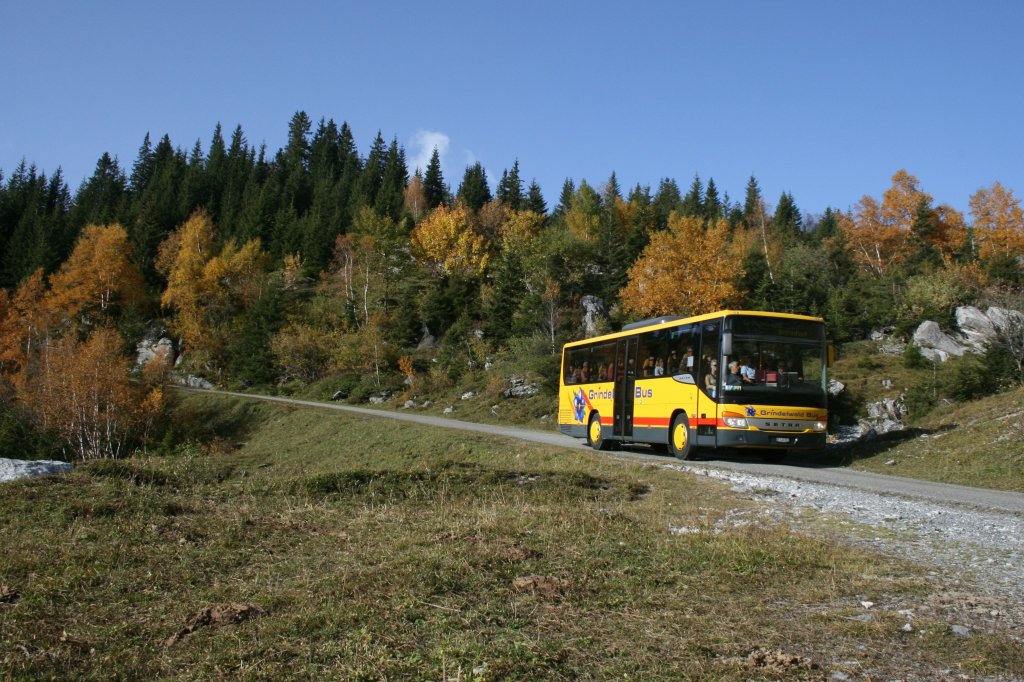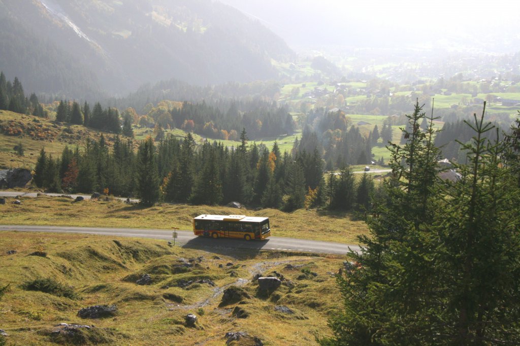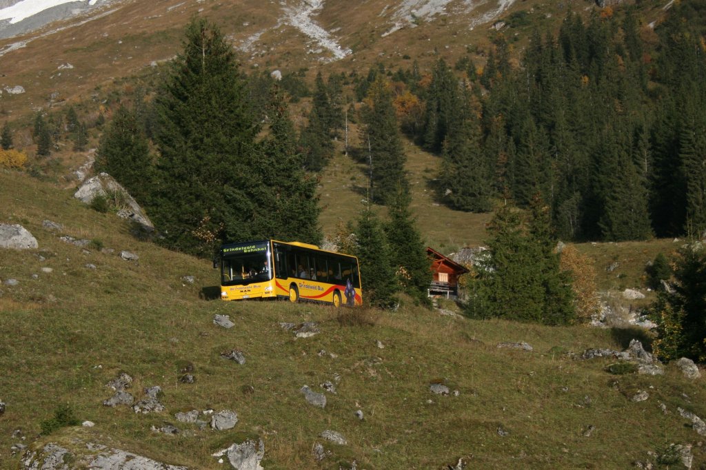 Die Zeit der alten Vetter-Hochflurbusse auf der Grossen Scheidegg ist langsam aber sicher zu Ende. Inzwischen sind bereits 4 MAN-Midibusse Bauart A22 auf der Linie im Einsatz, entgegen allen Vorurteilen ohne technische schwierigkeiten. Das Bild zeigt Wagen 24 auf Talfahrt beim oberen Lauchbühl am 9.10.2010.