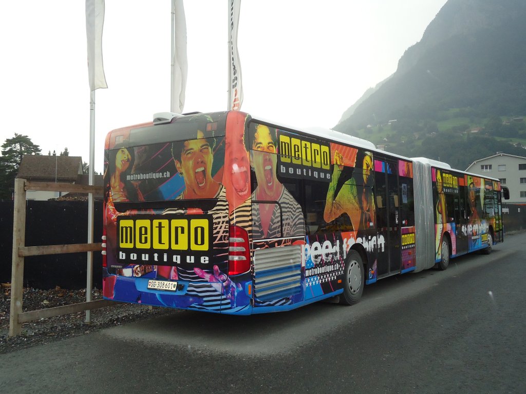 BSW Sargans Nr. 360/SG 308'601 Mercedes Citaro am 13. August 2010 Sargans, Bahnhof (mit Vollwerbung für "Metroboutique")