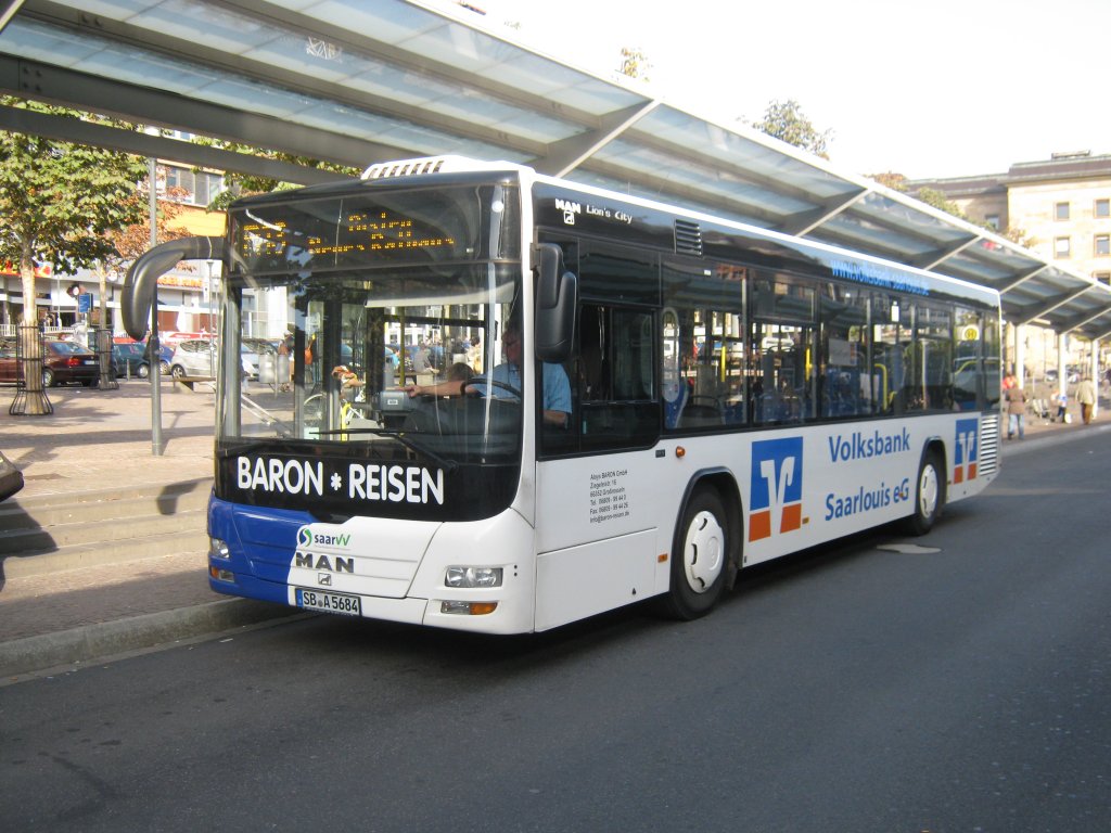 Ein neuer MAN LIONS CITY Bus der Firma Baron Reisen fährt im Auftrag von Saar-Pfalz-Bus Linienverkehr in Saarbrücken.