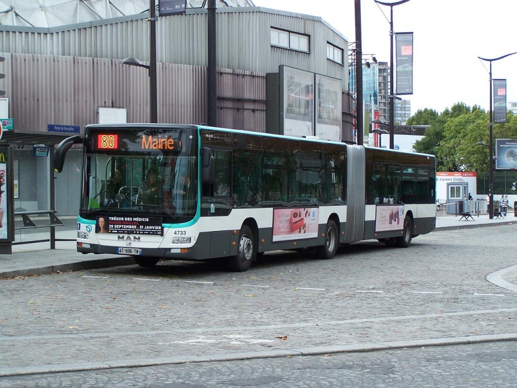 Lion's City Gelenkbus Nr 4733 der Linie 80, an der Haltestelle "Porte de Versailles" am 02/10/10.