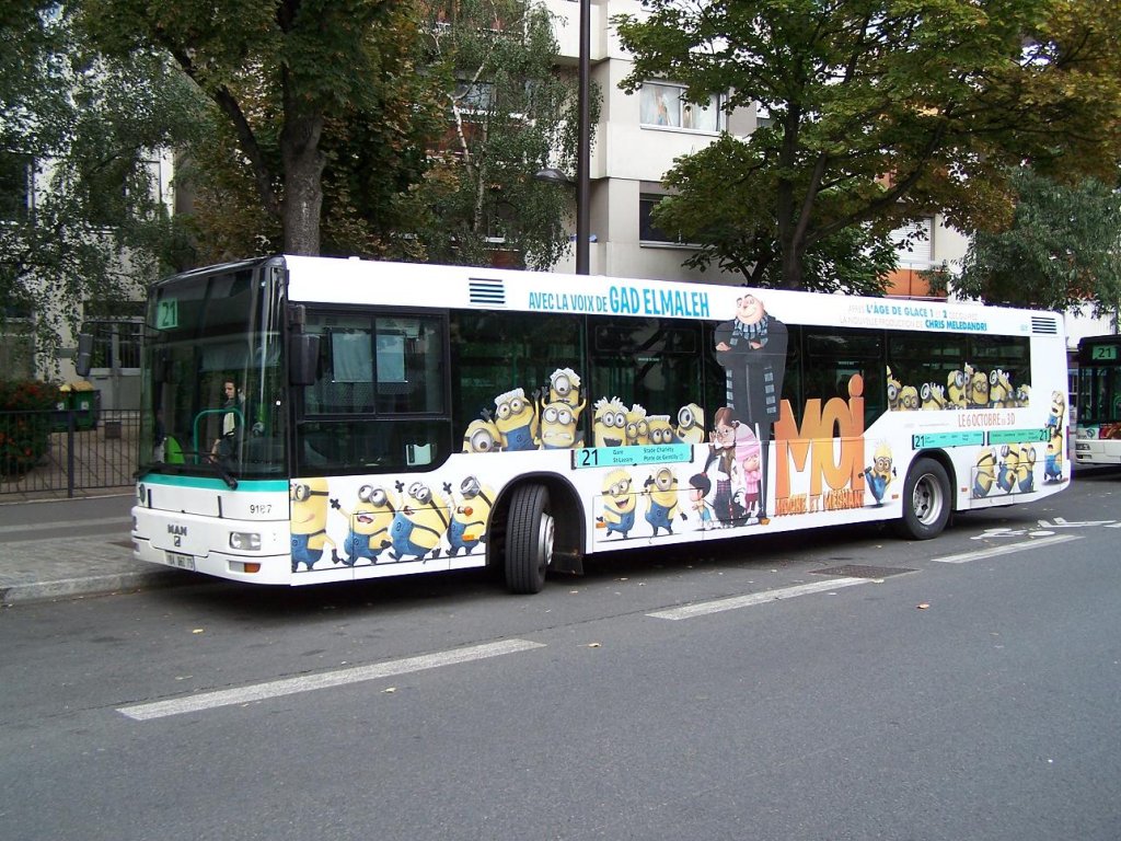 NL 223 Nr 9187 der Linie 21 mit Vollwerbung, "Porte de Gentilly" am 02/10/10.