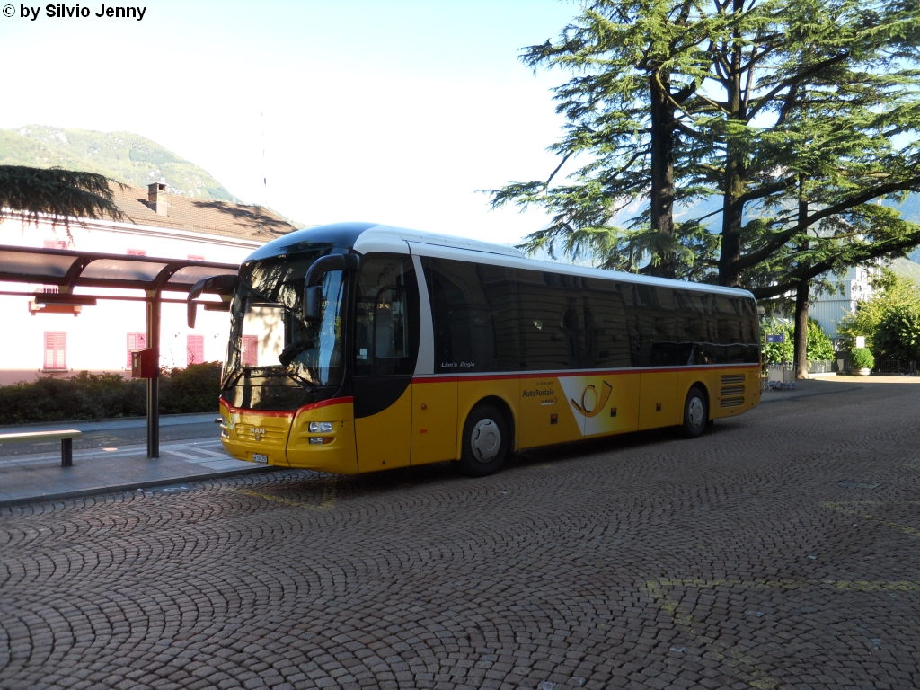 Postauto/PU Mutti GR 104 392 (MAN Lion's Regio R12) am 6.10.2010 beim Bhf. Bellinzona. PU Mutti ist der einzige Postautounternehmer der MAN Lion's Regio im Fahrzeugbestand hat, daneben haben nur noch die Regien Brig und Chur solche Fahrzeuge.