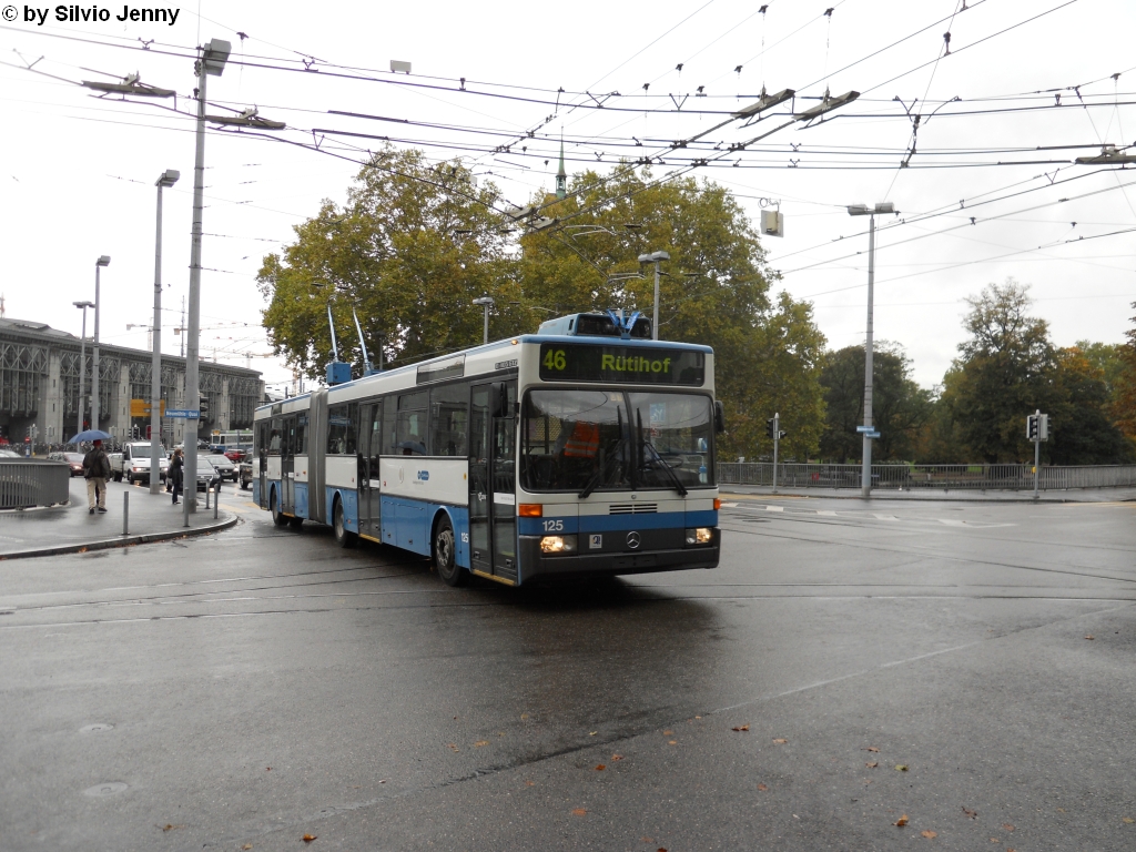 VBZ Nr. 125 (Mercedes O405GTZ) verlässt am 5.10.10 die Haltestelle Bahnhofquai/HB. Die Stadt Zürich lancierte Ende September 2010 während 2 Wochen die Aktion ''Fertig Puff'', die ein Zeichen gegen Jugendgewalt setzen soll. In der ganzen Stadt Zürich wurden Fahnen mit dem Aufdruck ''Fertig Puff'' montiert. Auch die VBZ beteiligt sich an der Aktion, indem sie ihre Fahrzeuge mit eben diesen Fähnchen schmückt.