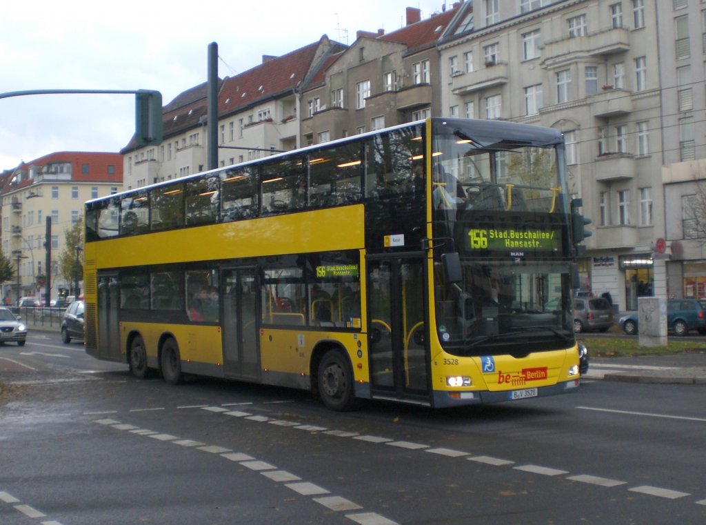 MAN Lion's City DD (Doppelstock) auf der Linie 156 nach S-Bahnhof Storkower Straße an der Haltestelle Stadion Buschallee/Hansastraße.