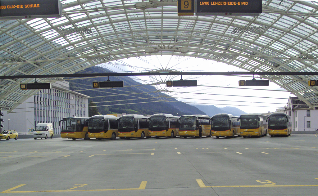 POSTAUTO- 2.Neoplan 5. MAN Lions Regio 1. Irisbus Crossway am Chur,Bahnhof am 13.9.10