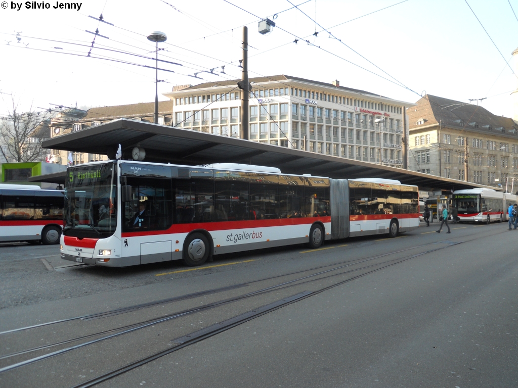 St.Gallerbus Nr. 287 (MAN Lion's City GL A23) am 15.4.2011 beim Bhf. St.Gallen. Eigentlich sind die Auto- und Trolleybus Einsätze bei der VBSG strikt getrennt, doch während den diversen Messen kann es halt dochmal vorkommen, dass ein Autobus auf einer Trolleylinie, in diesem Fall auf der Linie 5, eingesetzt wird.