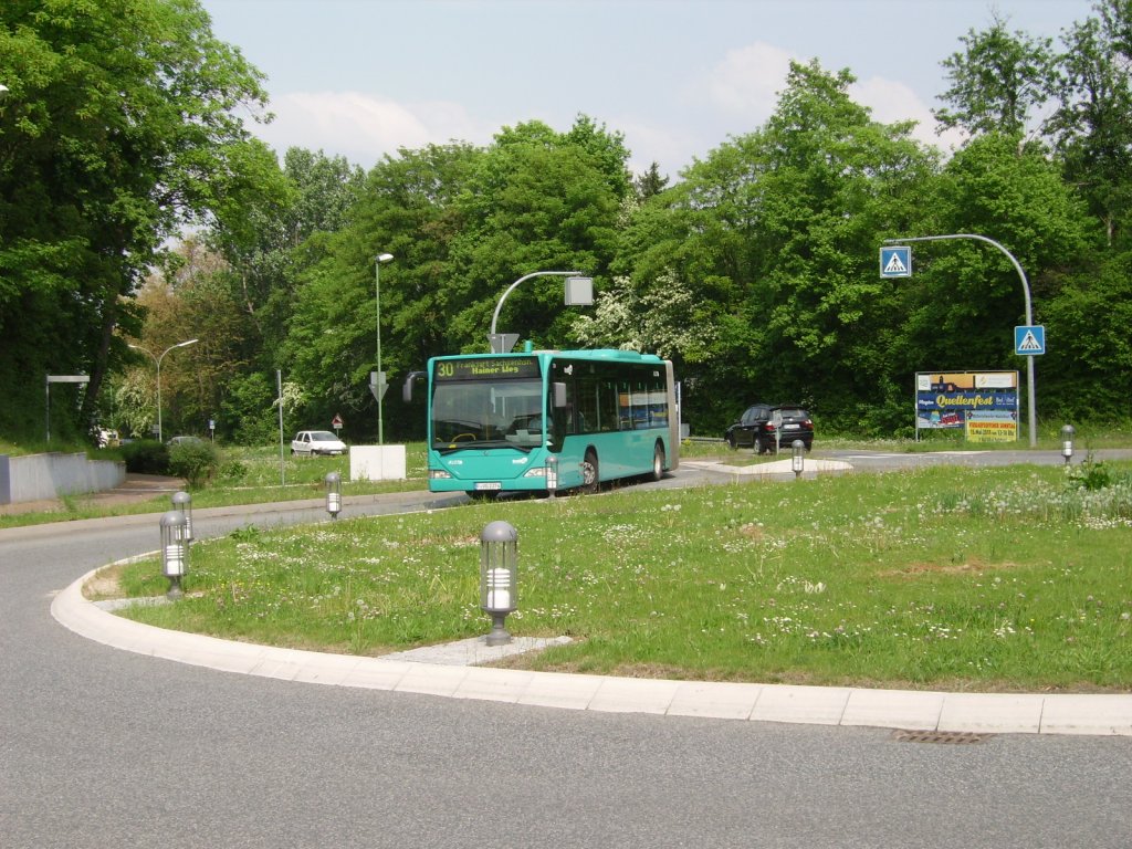 Ein VGF Mercedes Benz Citaro G fährt in den Kreisel am Bad Vilbeler Heilsberg am 28.04.11