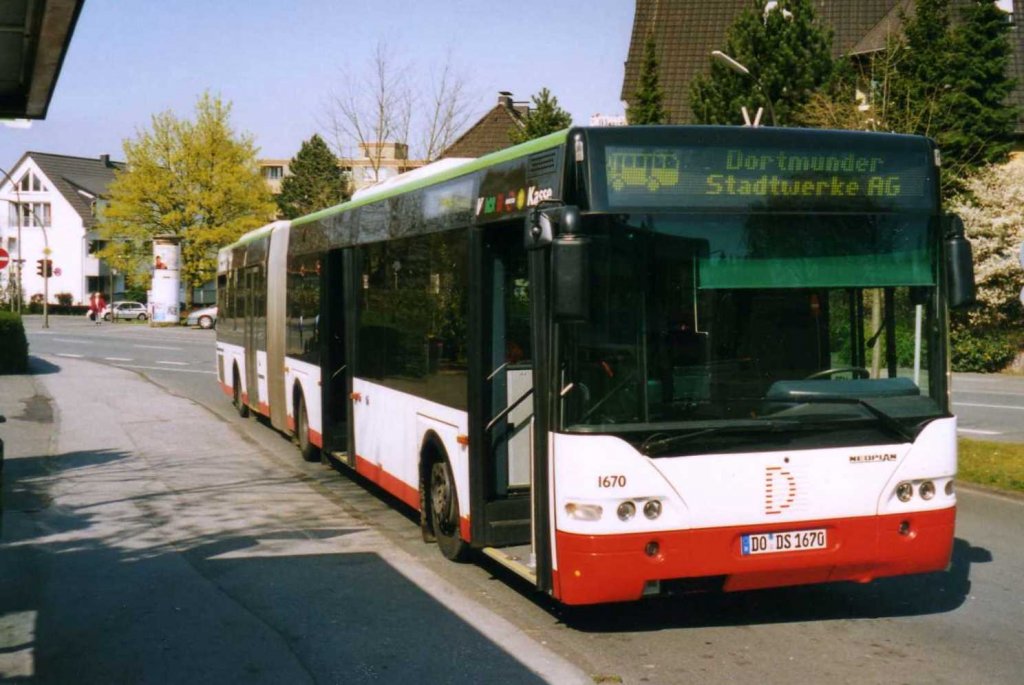 DSW 1670, ein Neoplan Centroliner N4421, aufgenommen im April 2002 an der Haltestelle Oespel Schleife in Dortmund.