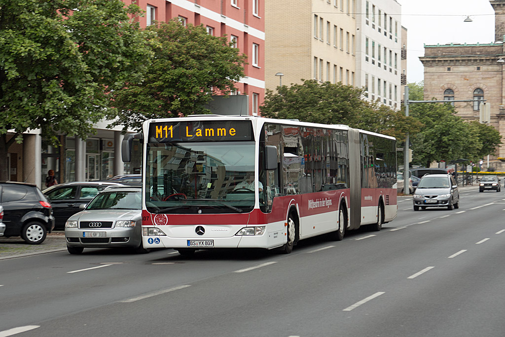 Durch die Braunschweiger Steinstraße fuhr am 8. August 2010 der BS-YX 807 von der Braunschweiger Verkehrs AG auf der Linie M11 nach Lamme, als die Haltstelle Rathaus erreicht wird. Neben den Busverkehr betreibt die Braunschweiger Verkehrs AG auch die Straßenbahn in Braunschweig.