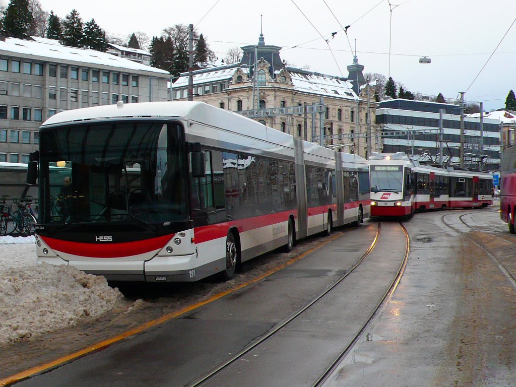 Hess Doppelgelenktrolleybus 191 parkiert beim Hauptbahnhof versperrt der Appenzellerbahn die Weiterfahrt am 19.12.2011.