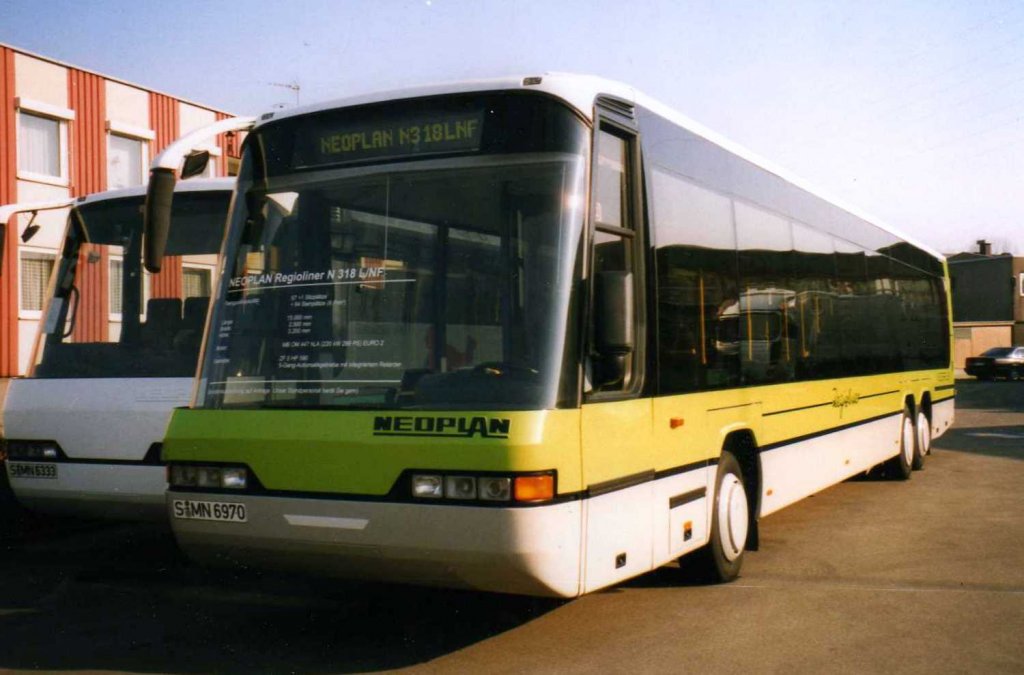 Neoplan Transliner N318 SHDL/3, aufgenommen im April 1998 auf dem Gelände der Neoplan NL Rhein Ruhr in Oberhausen.