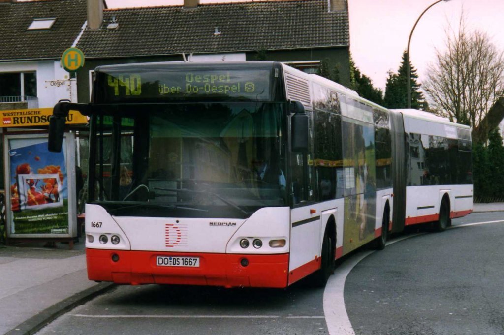 DSW 1665, ein Neoplan Centroliner N4421, aufgenommen im März 2002 an der Haltestelle Hacheney in Dortmund.