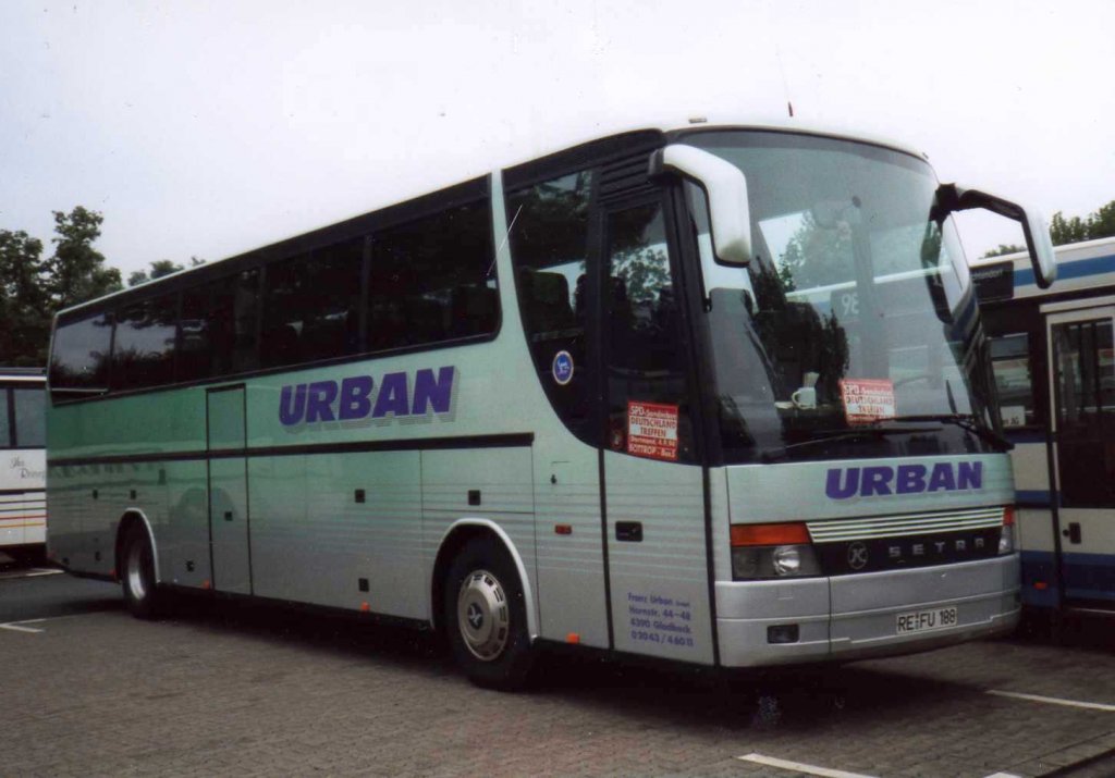Setra S214 HD, aufgenommen im August 1999 auf dem Parkplatz der Westfalenhallen in Dortmund.