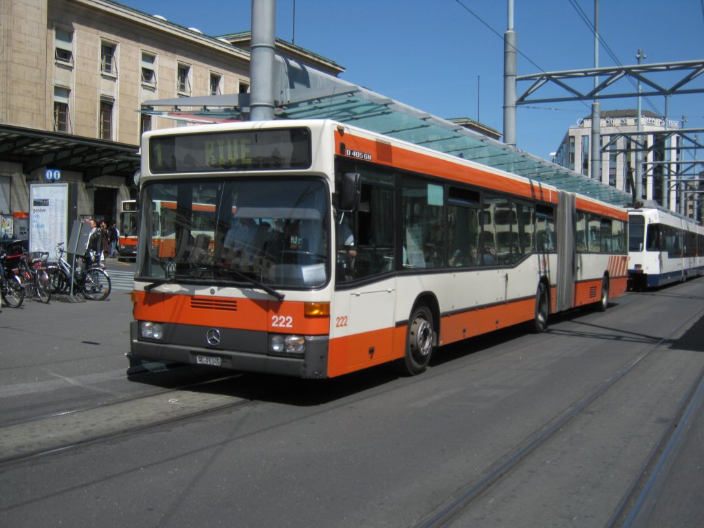 MB 405 GN Nr. 222 auf der Linie 1 bei der Haltestelle Gare Cornavin, 05.05.2011.
