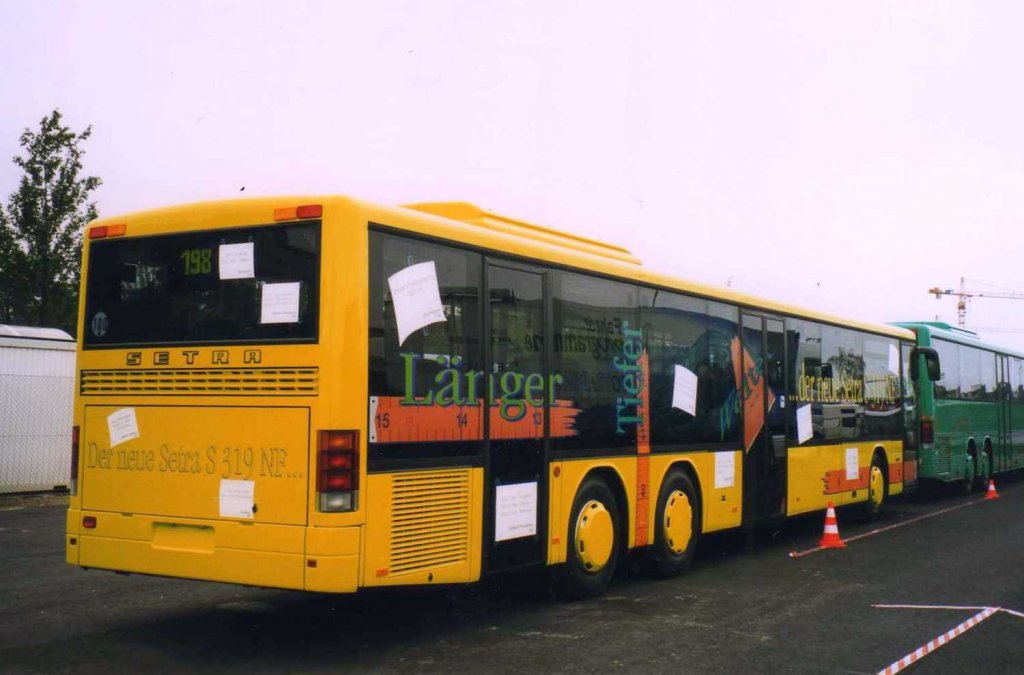 Setra S319 HDH, aufgenommen im Juni 2002 im GWZ der Evobus NL Dortmund.