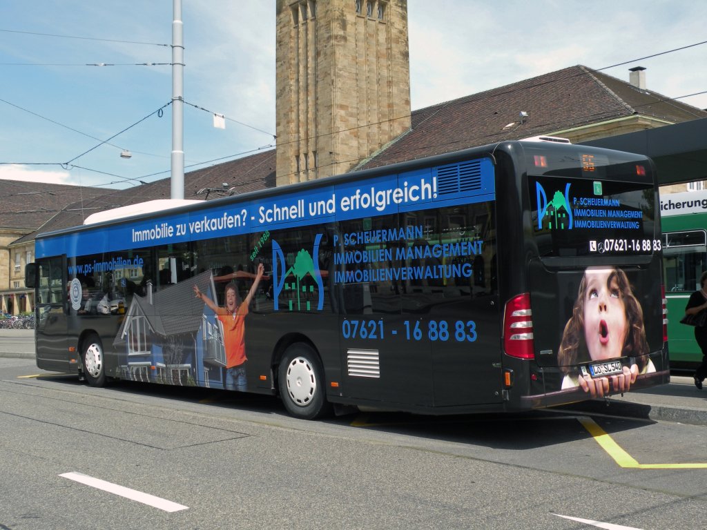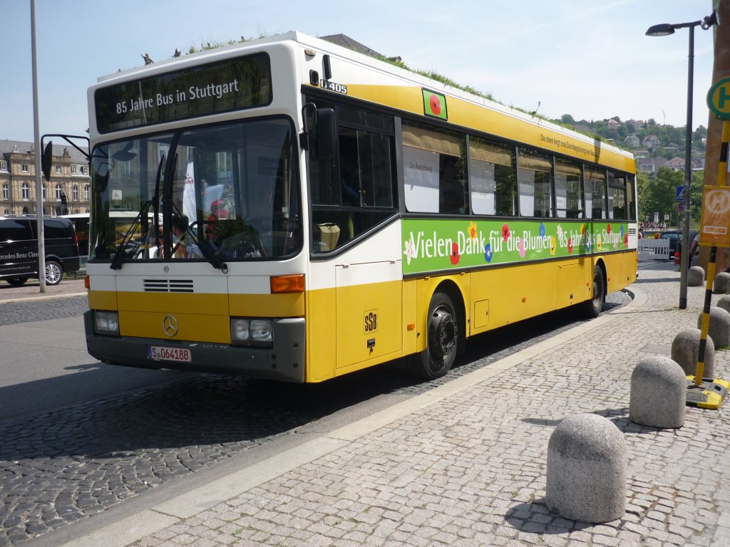 Ein MB-O 405 der SSB- Stuttgart mit Dachbegrünung, die man leider nicht sieht. Am 07.05.2011 am Schloßplatz in Stuttgart aufgenommen.