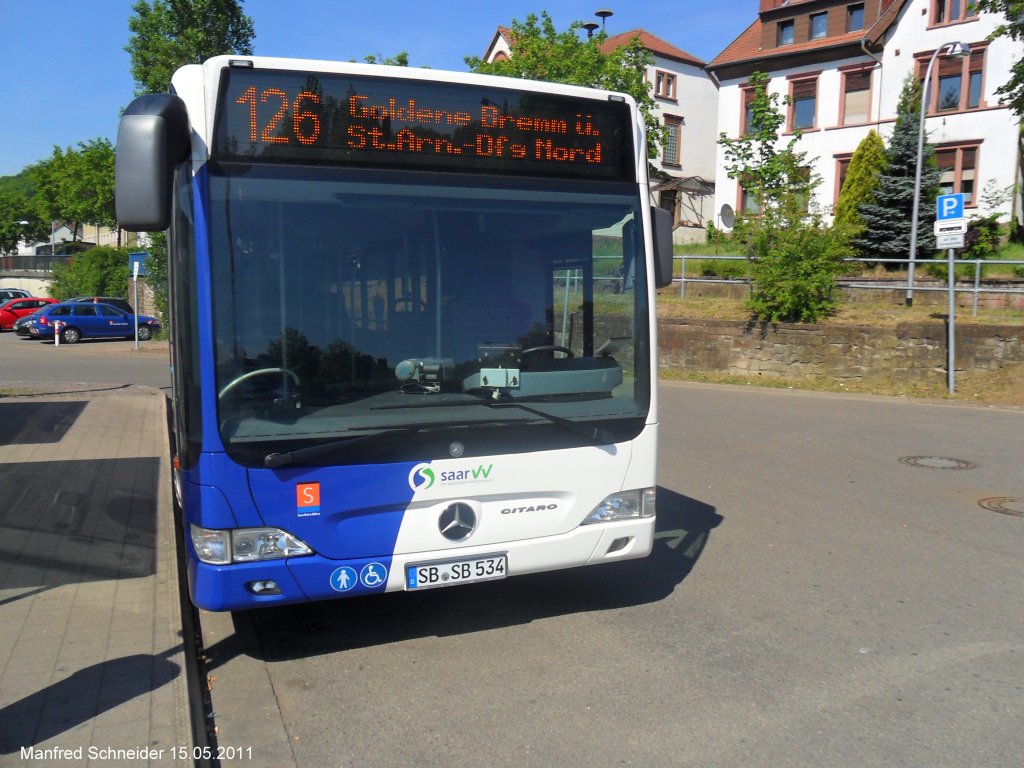 Ein Mercedes Citaro Bus der Firma Saarbahn und Bus steht an der Haltestelle Bahnhof Brebach. Das Foto habe ich am 15.05.2011 gemacht.
