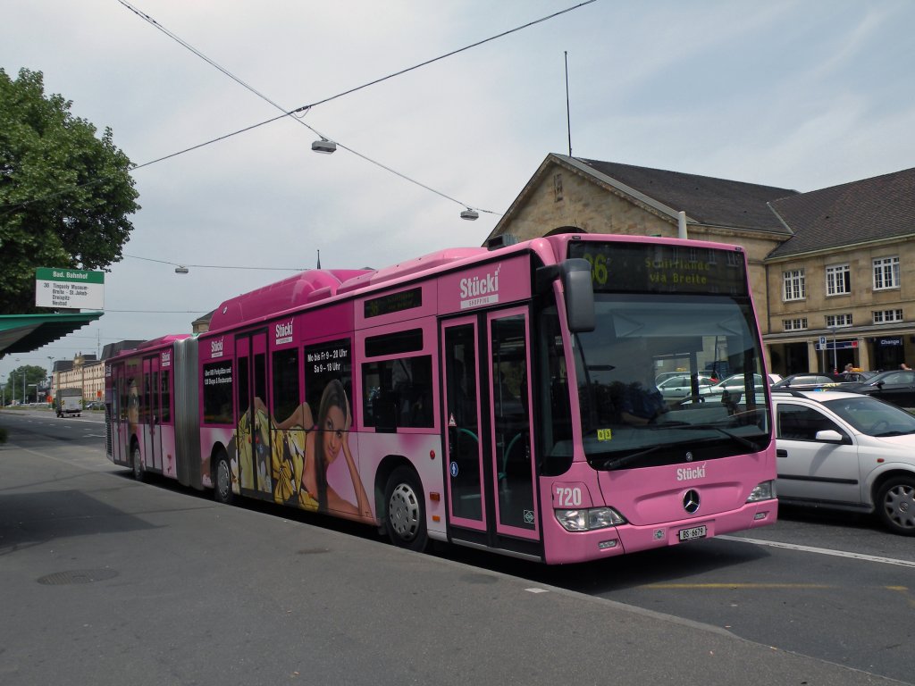 Mercedes Citaro mit der Betriebsnummer 720 und der Stücki Vollwerbung auf der Linie 36 am Badischen Bahnhof in Basel. Die Aufnahme stammt vom 10.05.2011.