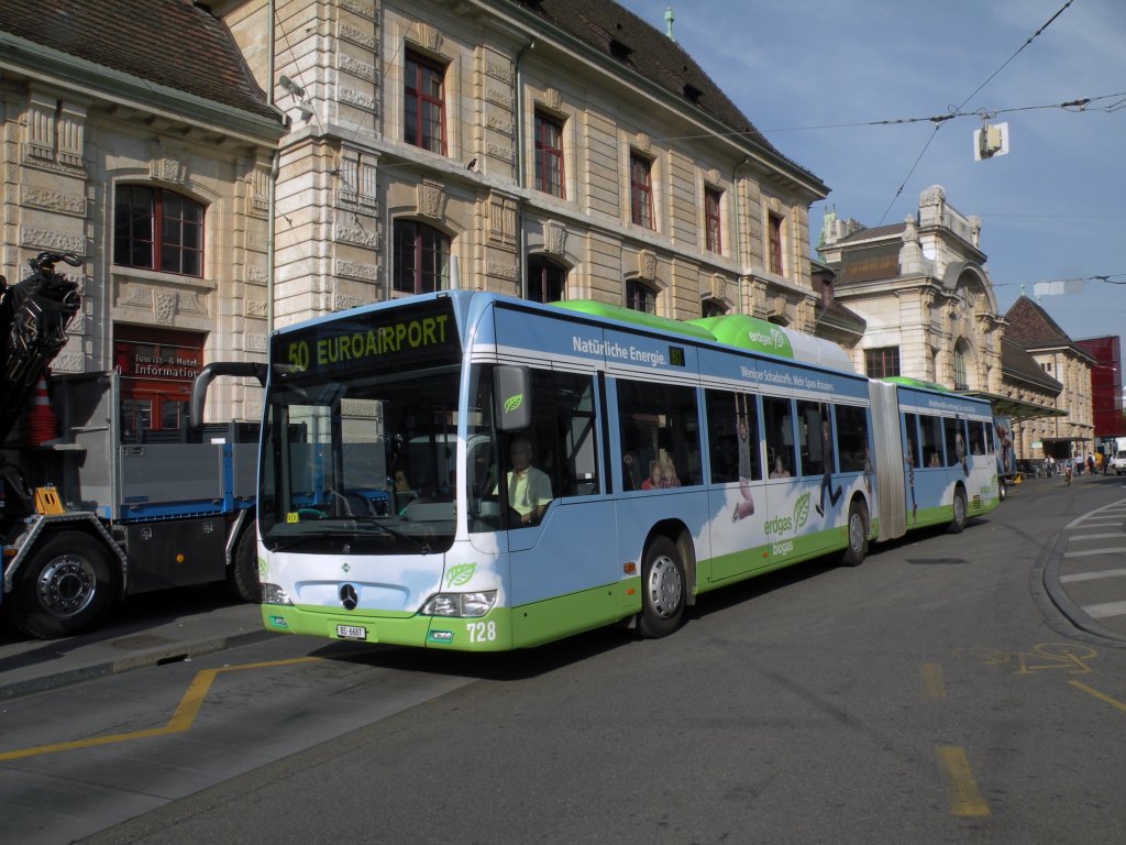 Mercedes Citaro mit der Betriebsnummer 728 und der Erdgas/Biogas Vollwerbung auf der Linie 50 am Bahnhof SBB in Basel. Die Aufnahme stammt vom 10.05.2011.