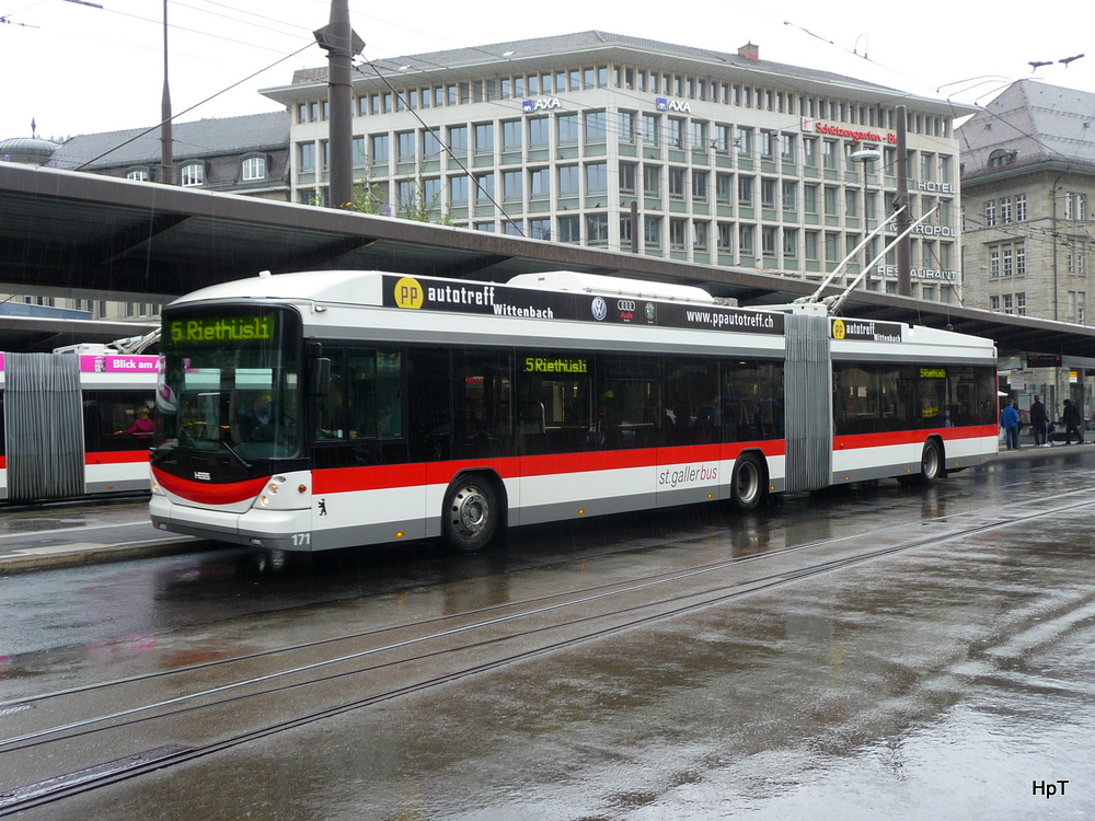 VBSG - Hess-Swisstrolley BGT-N2C Nr.171 unterwegs auf der Linie 5 in St.Gallen bei den Haltestellen vor dem Bahnhof am 14.05.2011