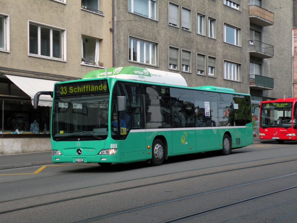 Mercedes Citaro mit der Betriebsnummer 808 auf der Linie 33 an der Haltestelle Universitätsspital in Basel. Die Aufnahme stammt vom 14.05.2011.