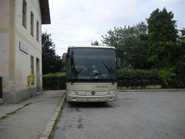 Ein Mercedes Integro von ÖBB-Postbus am 11.8.2011 kurz vor einem heftigen Gewitter am Bahnhofsvorplatz von Frauenkirchen.