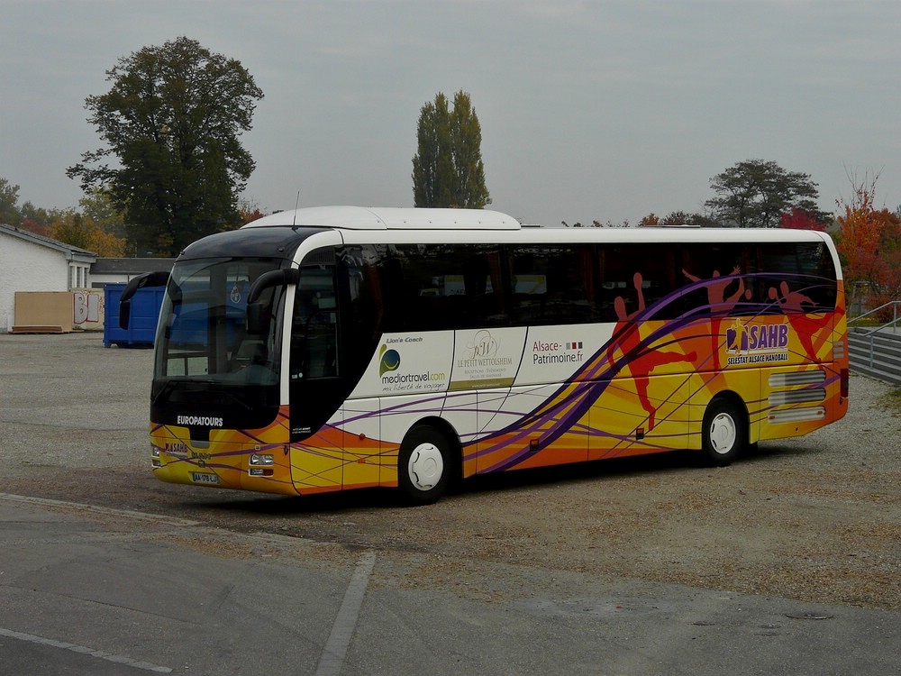 Nachschuss auf den schönen farbigen MAN Lion's Coach Handballvereinsbus in der Nähe des Europaparlaments in Strasbourg. 30.10.2011
