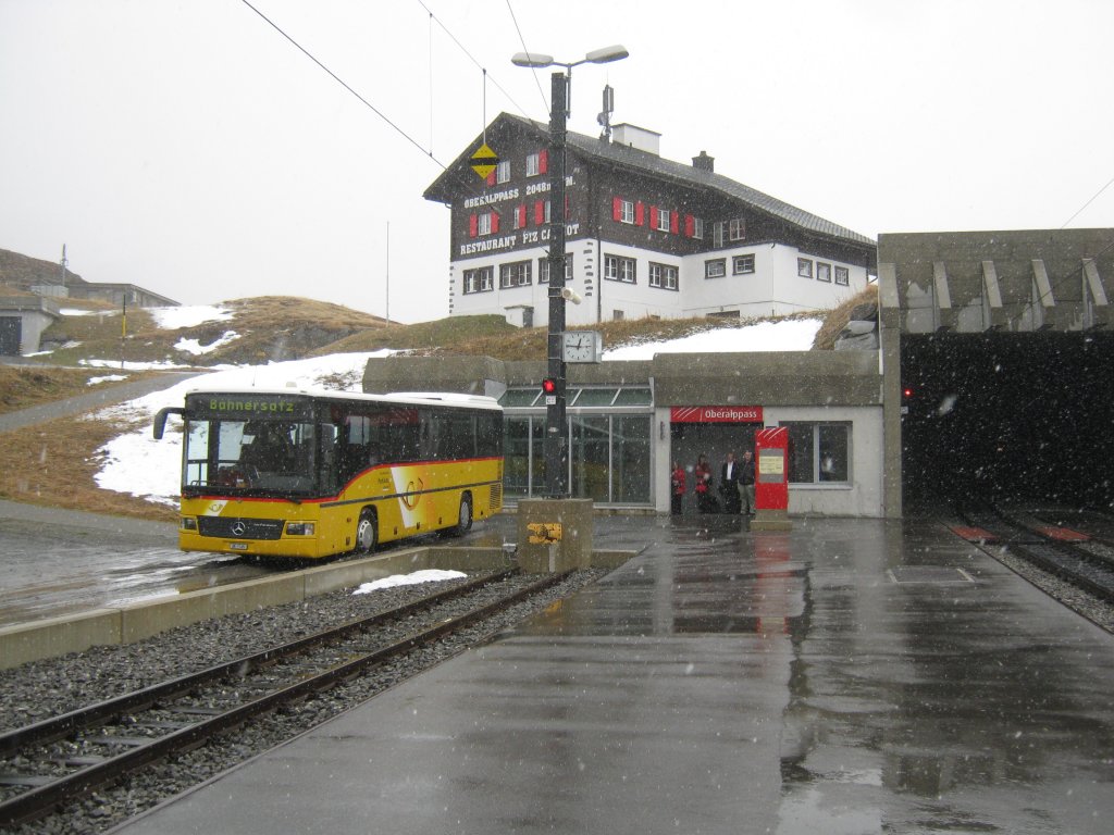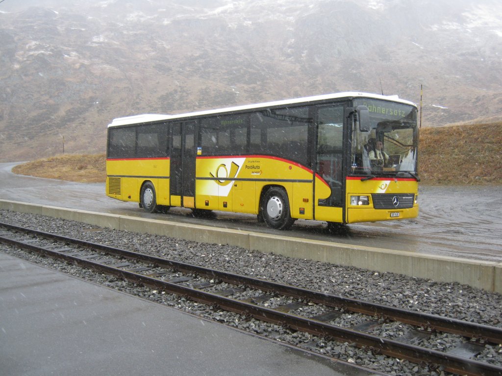 Mercedes Integro Postauto Uri als Bahnersatz Andermatt-Oberalppass auf der Passhöhe (2048 m. ü. M.) Oberalppass, 08.11.2011.