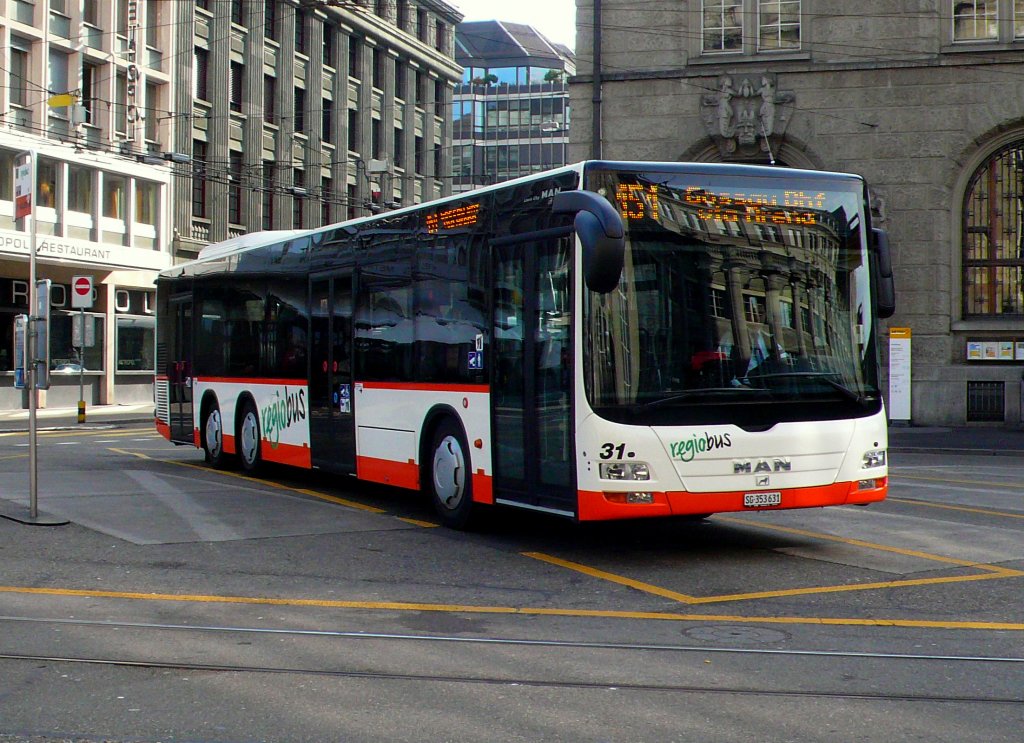 Neue MAN Lions-City 3-Achsig Nr.31 der Regio-Bus auf dem Bahnhofplatz in St. Gallen am 30.10.2011.